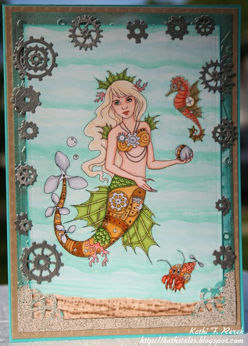 I resized all three digital stamps and created a scene with them using PhotoElements. The scene was printed out onto Neenah cardstock using my laser printer, then colored using Copic markers. All the rivets, the bubbles, the compass on Nancy's Mech Seahorse, and the claws and eyes of Steampunk Hermit were coated with several layers of Clear Gelly Roll Glaze pen to add clear dimension to them. I also used this pen to add some air bubbles above Nancy's Mech Seahorse. A Clear Stardust Glitter pen was used to add glitter to the orb in the Steampunk Siren's hand.